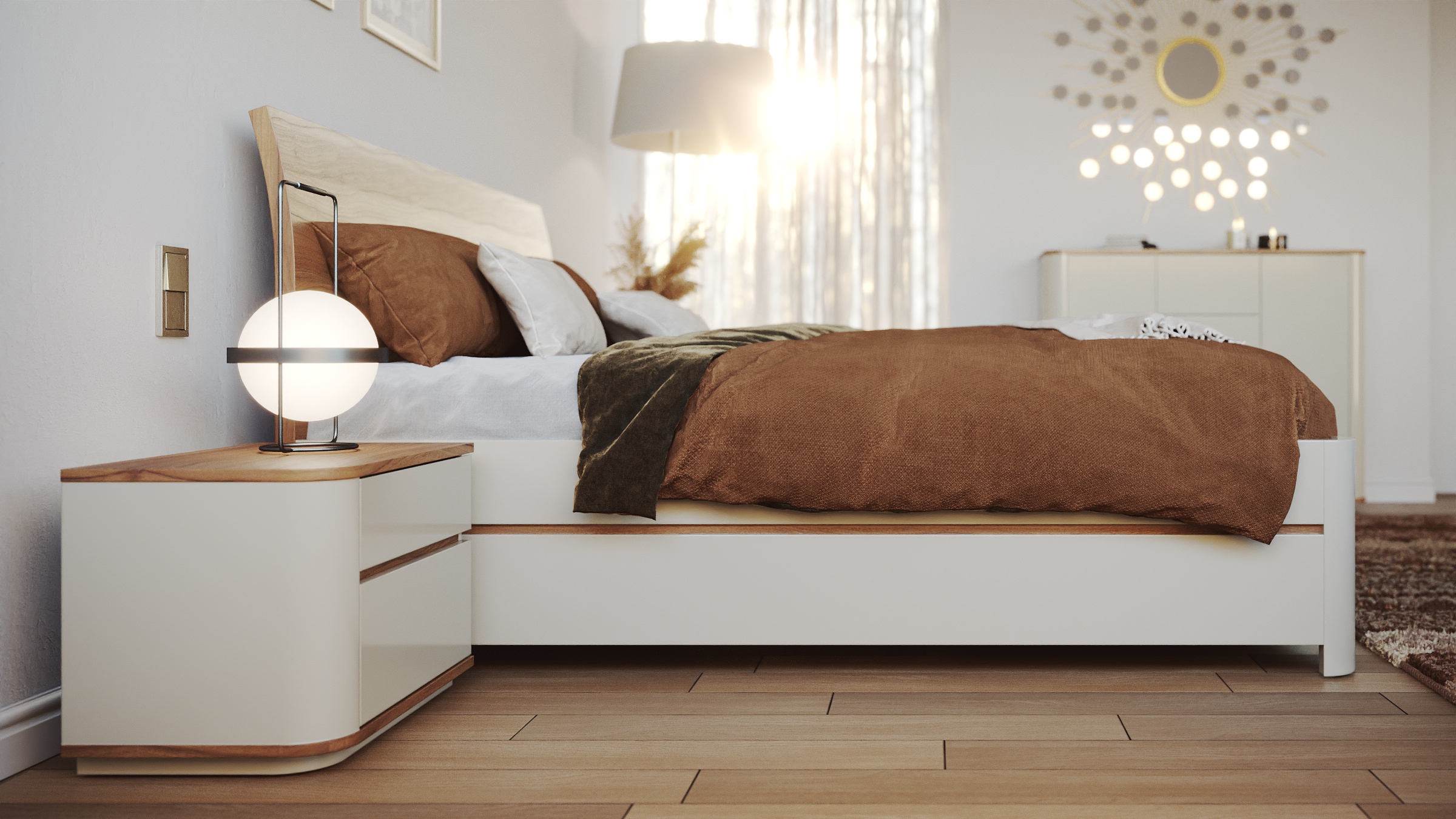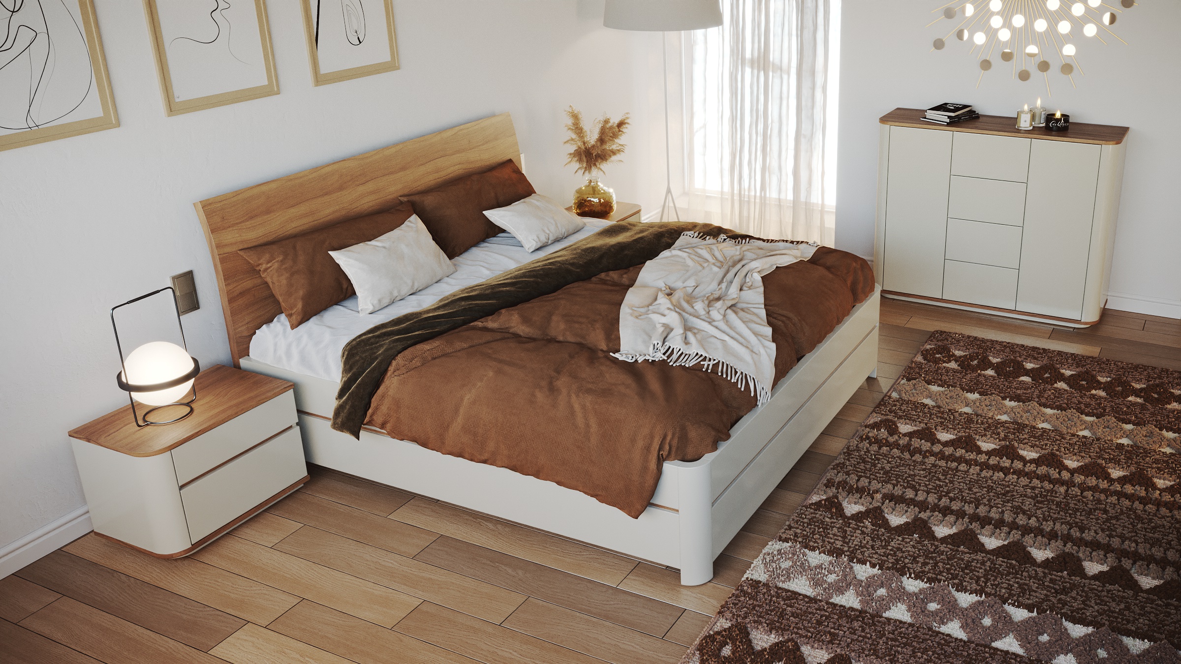 - Varianty matných barev RAL pro korpus lůžka, nočních stolků a skříněk: bílá/písek/cappuccino/antracit/slonová kost