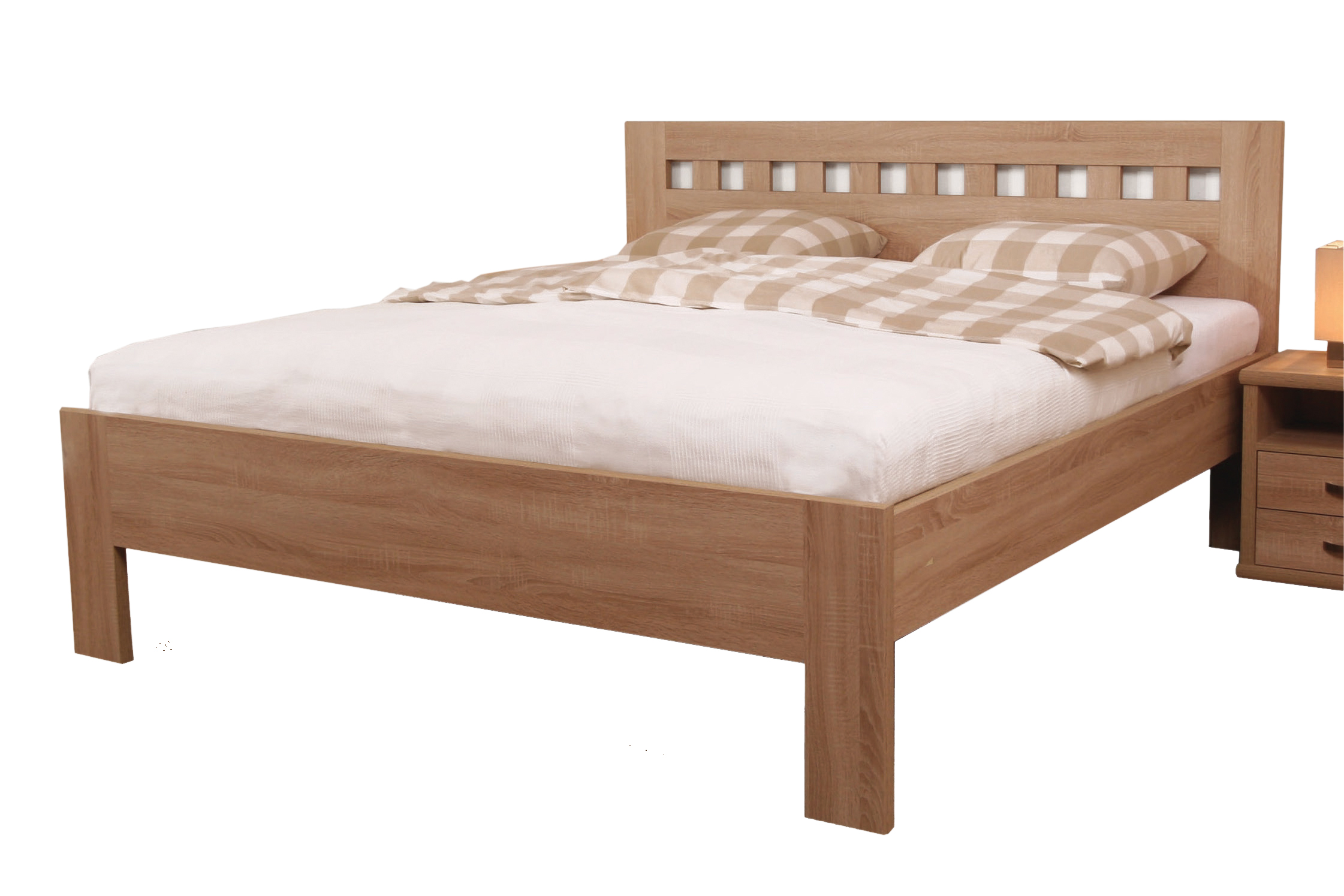 Moderní postel ELLA s mozaikovým čelem v sobě spojuje praktické využití s dokonale propracovanými liniemi. Průřezy v čele postele vytváří zajímavý vzhled, který působí geometricky dokonalým dojmem. V případě imitace dřeva jsou hrany materiálu opatřeny ABS hranou odolnou proti mechanickému poškození. Hrany postele z masivního přírodního dřeva jsou opatřeny ozdobnou designovou fazetou. Vysoce kvalitní postel české výroby zajišťuje pohodlné a zdravé ležení.