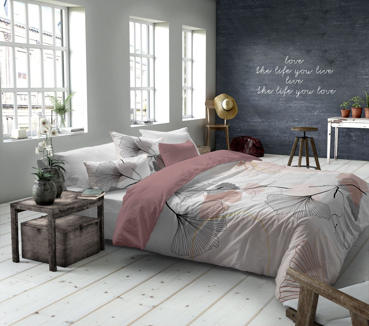 Povlečení z bavlněného makosaténu v rozměru 70x90 / 140x200 se zapínáním na zip zaujme digitálním potiskem růžovo-šedých lístků ginka. Top kvalita pro váš maximální komfort a stylovou ložnici.