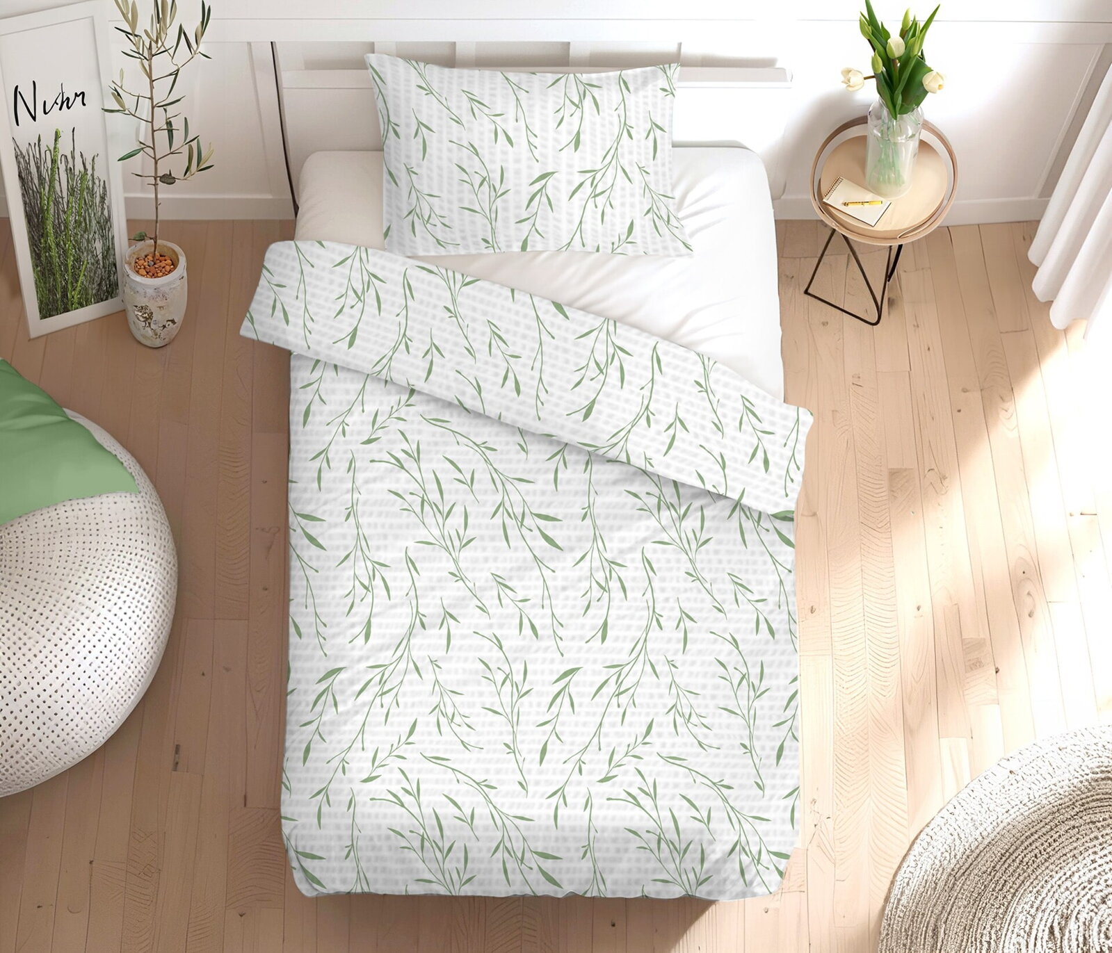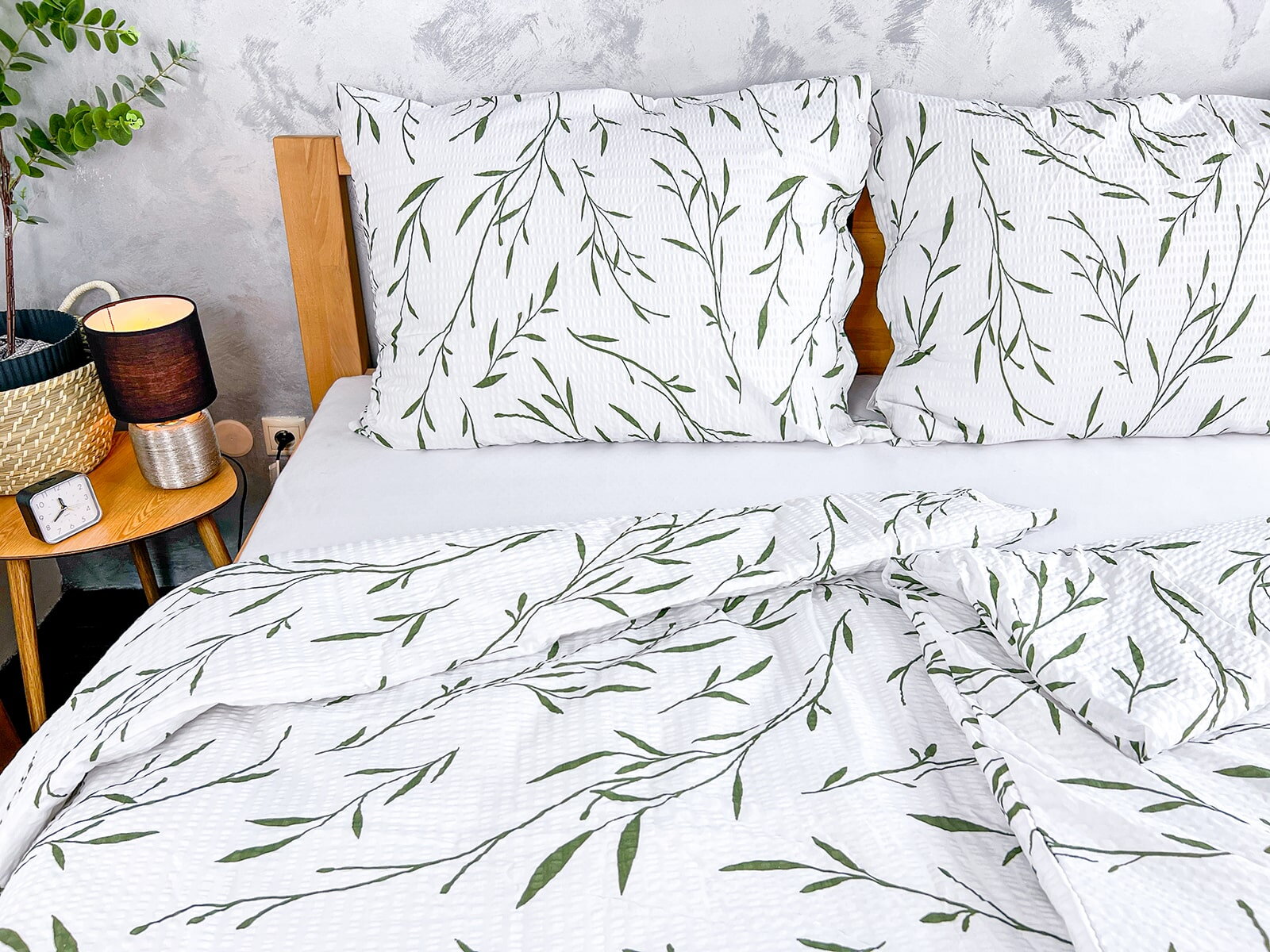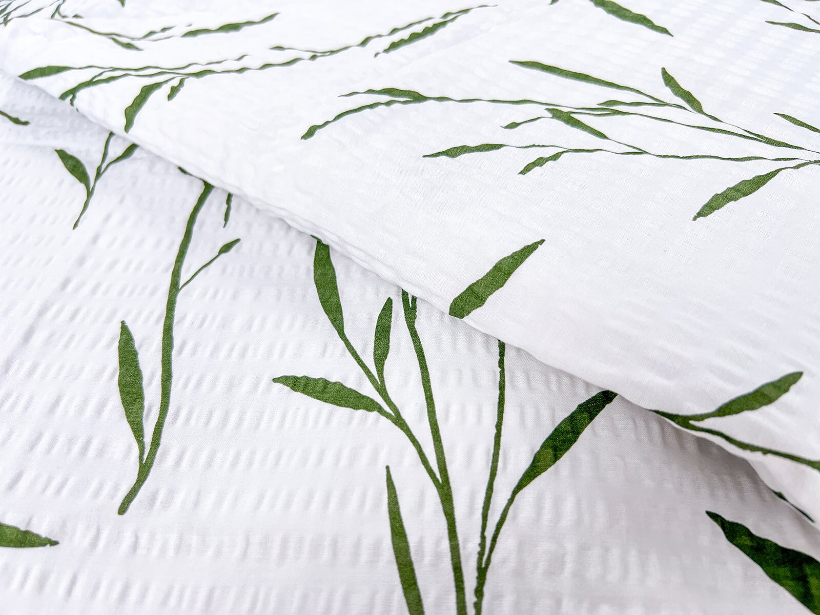 Krepové povlečení s tiskem listů zelené barvy na bílém podkladě z měkké bavlny. Praktické povlečení, které potěší v každém ročním období jsou ideálně pro ty kteří milují postelové povlečení bez starostí se žehlením. Krepová struktůra bavlněného povlečení jim dodává vzdušný a nadýchaný vzhled a 100% bavlněné příze dokonalou vzdušnost a savost.