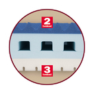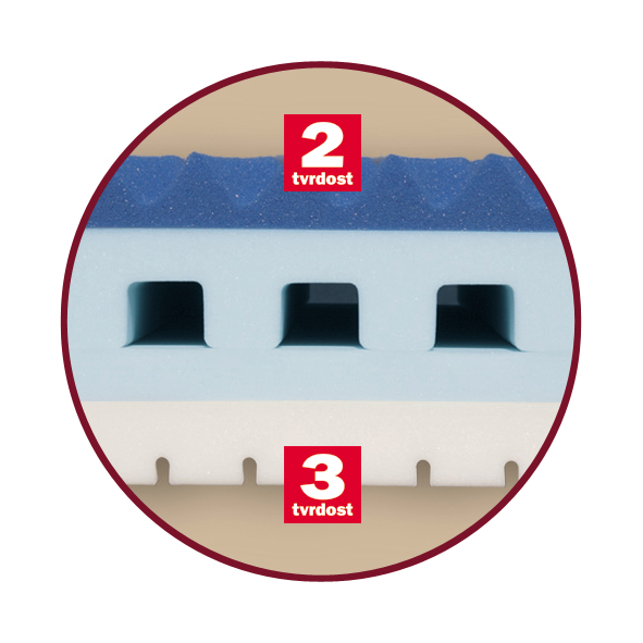Unikátní provzdušněná matrace s chladivým efektem. Jádro matrace je tvořeno tvrzenou pěnou MediFoam s příčnými otvory. Modrá chladivá viscoelastická pěna ArcticFoam zajistí optimální regulaci teploty během spánku a obsahuje přírodní geneticky neupravený sója olej. Tvrdší stranou matrace je bílá MediFoam pěna, která je provzdušněna speciálním příčným a podélným průřezem.