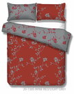 Elegantní saténové povlečení s potiskem bílých květin v červených a šedých tónech a na olivově zeleném podkladě.