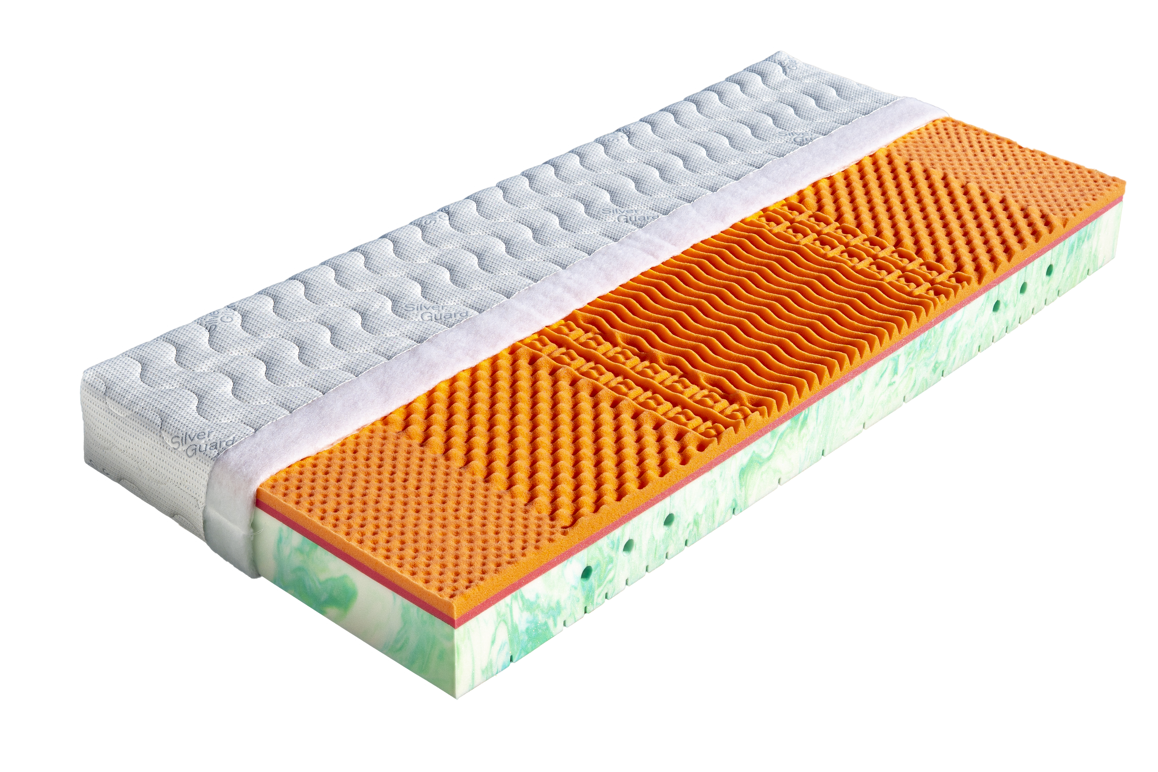 Sedmizónová matrace s pevnější stranou z pěny MediFoam (32 kg/m³), která má zónovité prořezy. Navíc její otvory v místech pod rameny vytvářejí tzv. ramenní kolébku – ideální pro spaní na boku. Horní stranu změkčuje viscoelastická pěna (45 kg/m³). Pěna mění svou tuhost v závislosti na teplotě. Rovnoměrně rozkládá tlak materiálu na ležící tělo a nevytváří protitlak. Pohodlný spánek zaručuje tvarování do tzv. masážních nopů. Ke zvýšení komfortu je navíc podepřena červenou antibakteriální pěnou (32 kg/m³) s úpravou Sanitized pro ochranu proti bakteriím a roztočům. Matrace je vhodná na všechny typy roštů.