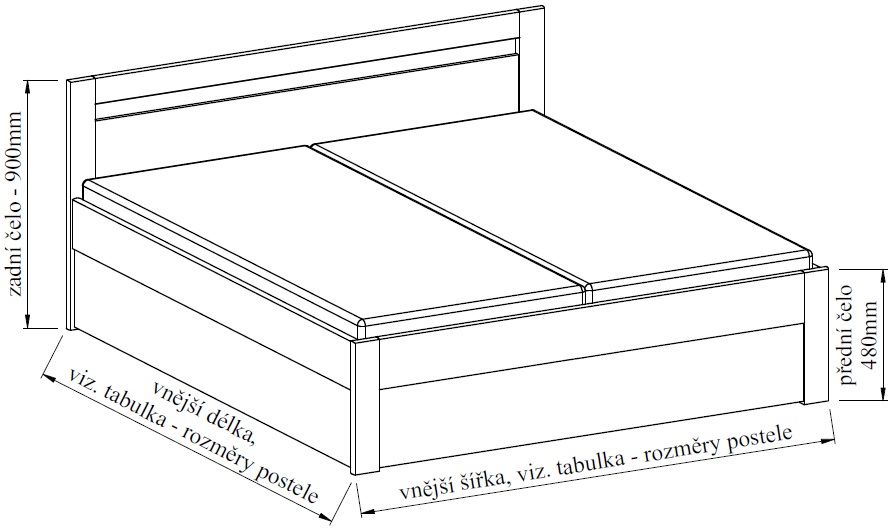 Postel nabízíme ve dvou velikostech, podle rozměrů vaší ložnice můžete volit postel širokou 160 cm nebo 180 cm. Délka postele je 200 cm. Postel má zvýšenou lehací plochu, která umožňuje pohodlnější vstávání a uléhání do postele, což ocení všichni uživatelé bez rozdílu věku.