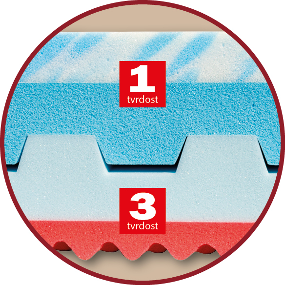 Jádro této matrace tvoří pěna MediFoam (30 kg/m³), která má skvělé podpůrné vlastnosti. Červená ložná plocha je tvořena antibakteriální pěnou tvarovanou do masážních nopů s úpravou Sanitized (32 kg/m³). Je vhodná nejen pro alergiky. Její druhá strana je tvořena žlutou línou pěnou (45 kg/m³), která je taktéž tvarovaná do nopů. Použitím této pěny se snižuje protitlak matrace na ležící tělo. Je vhodná pro všechny typy roštů.