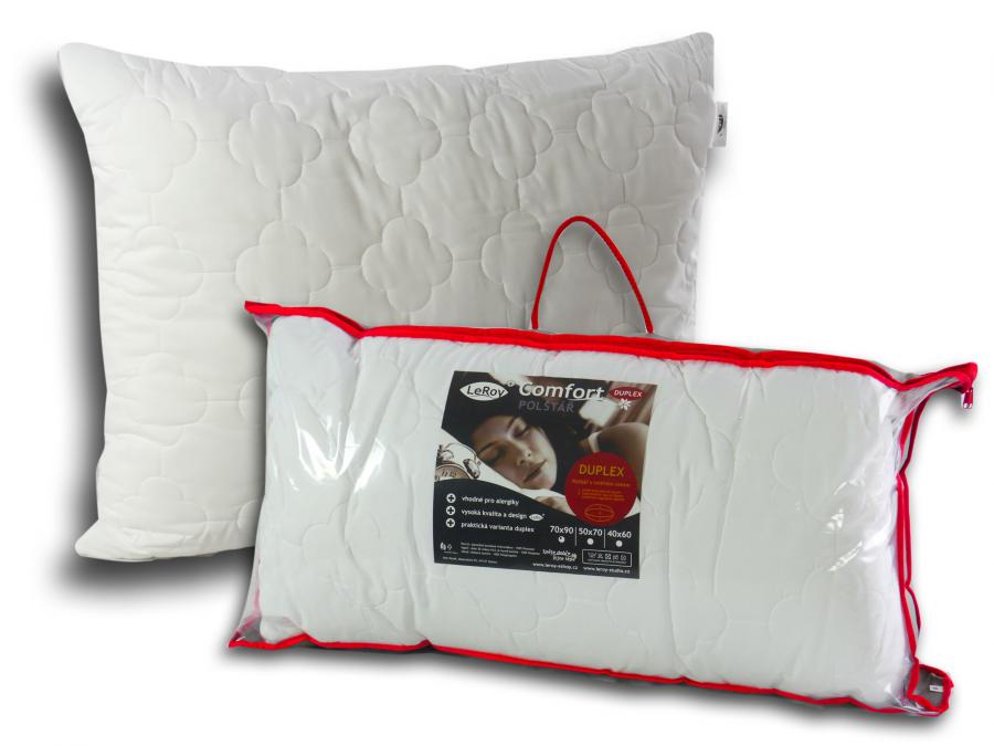 Komfortní polštáře LeRoy® vynikají vysokou kvalitou zpracování, hebkým povrchem tvořeným zjemněným mikrovláknem a výplní, která je tvořena z jemných polyesterových kuliček. Varianta DUPLEX je praktické provedení polštáře, které umožňuje samostatné praní potahu nebo vnitřního vaku se zipem, ve kterém je uložena vnitřní náplň. Lze prát na 60°C, což zaručuje vysoký hygienický standard.