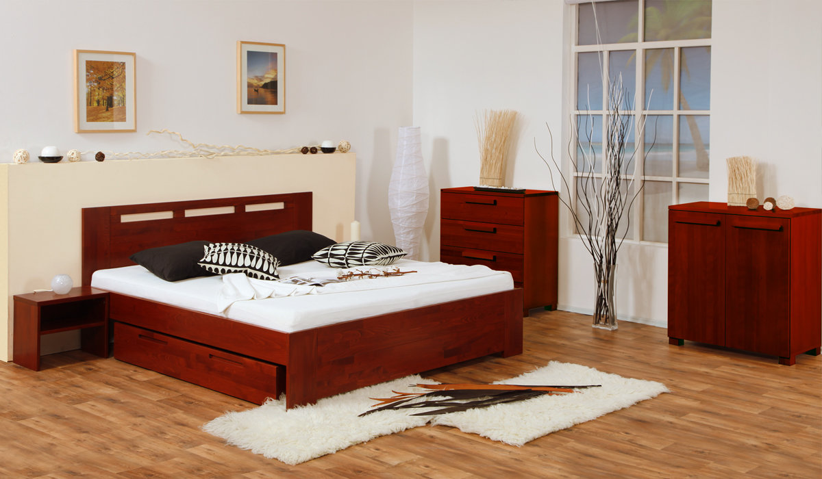 Celomasivní dřevěná manželská postel s možností úložného prostoru v podobě výsuvného šuplíku. Nosnost postele na jedno lůžko 130 kg. Vhodné pro matrace 2 ks 80, 90 x 200 cm nebo pro 1 ks 160, 180 x 200 cm.